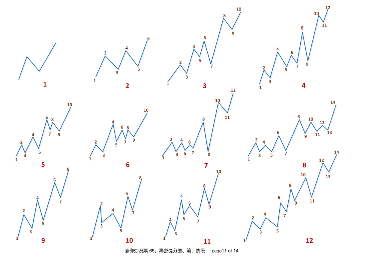 图中每种走势中的每一划都代表实际走势中的一笔,请问,里面构成一段线段走势的有多少种? (ref. 《65课后附录:出题,有空的都请进来》)