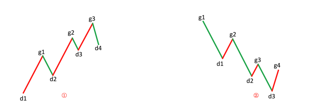 第二种情况:\ 特征序列的顶分型中,第一和第二元素间存在特征序列的缺口,如果从该分型最高点开始的向下一笔开始的序列的特征序列出现底分型,那么该线段在该顶分型的高点处结束,该高点是该线段的终点;特征序列的底分型中,第一和第二元素间存在特征序列的缺口,如果从该分型最低点开始的向上一笔开始的序列的特征序列出现顶分型,那么该线段在该底分型的低点处结束,该低点是该线段的终点。
